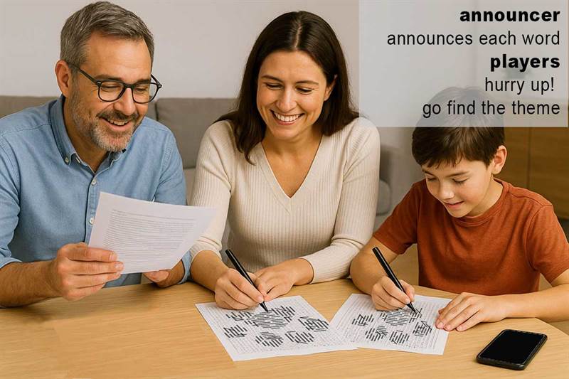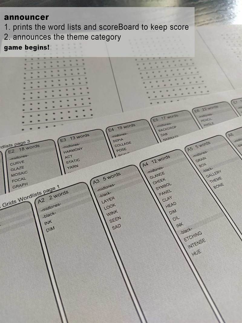 - Each player receives a printed gamesheet with a grid of word-search mini puzzles 3X3 or more